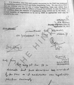 रक्षा मंत्रालय ने जो नोट भेजा था उसे उप सचिव एस के शर्मा ने तैयार किया था. जिसे ख़रीद प्रबंधक व संयुक्त सचिव और ख़रीद प्रक्रिया के महानिदेशक दोनों ने ही समर्थन दिया था. रक्षा मंत्रालय के इस नोट से पता चलता है कि उन्हें इसकी भनक तक नहीं थी. 23 अक्तूबर 2015 तक कुछ पता नहीं था कि प्रधानमंत्री कार्यालय भी अपने स्तर पर रफाल विमान को लेकर बातचीत कर रहा है.