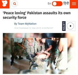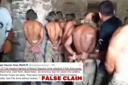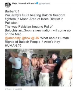 पूर्व सेनाधिकारी और रिपब्लिक टीवी के शो ‘पेट्रियट’ के होस्ट मेजर गौरव आर्या ने 14 मार्च को एक वीडियो ट्वीट किया। इस वीडियो में, आंखों पर पट्टी बंधे कुछ सैनिकों, जिनके हाथ उनकी पीठ पीछे बंधे हैं, उन्हें दो वर्दीधारी कर्मियों द्वारा बुरी तरह पीटते हुए दिखलाया गया है। इस वीडियो के साथ दिए गए संदेश में कहा गया है, “27 फरवरी को बलोच रिपब्लिकन आर्मी के स्वतंत्रता सेनानियों ने बलोचिस्तान में केच जिले के मंड क्षेत्र में सेना की 3 चौकियों पर हमला किया। यह हमला इतना भयंकर था कि फ्रंटियर कोर के सैनिक भाग खड़े हुए। वे पाक आर्मी एसएसजी द्वारा पकड़ लिए गए और क्रूरतापूर्वक पीटे गए।” -( अनुवाद)