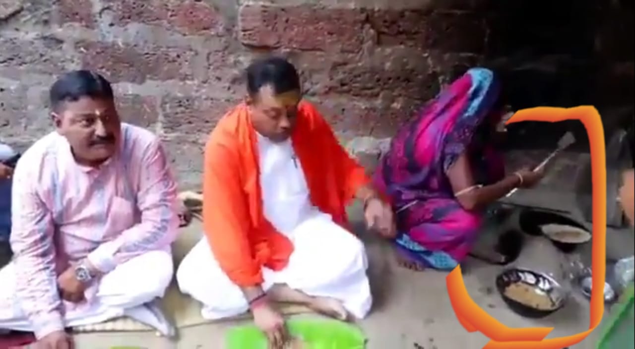 पार्टी प्रचार के लिए संबित पात्रा एक ग़रीब महिला के घर भोजन करने पहुंचे थे. जहां महिला चुल्हे पर खाना बनाते दिख रही है.