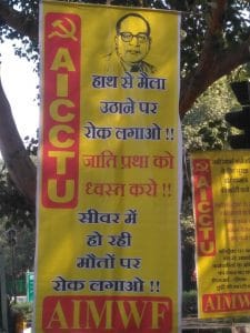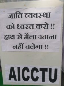 ऑल इंडिया सेंट्रल काउंसलिंग ऑफ ट्रेड यूनियन (ऐक्टू) ने शुक्रवार को जंतर-मंतर पर सफाई कर्मचारियों की सफाई के दौरान होने वाली मौतों और मैला ढोने वालों की समस्याओं को लेकर मोदी सरकार के ख़िलाफ़ प्रदर्शन किया. ऐक्टू के साथ देशभर के अलग-अलग राज्यों से सफाईकर्मियों के कल्याण के लिए कार्य करने वाले संगठनों (ऑल इंडिया म्यूनीसिपल वर्कर्स फेडरेशन, उत्तर प्रदेश सफाई मज़दूर एकता मंच, आदि) ने भी हिस्सा लिया. यहां आए सफाईकर्मियों ने मांग की कि सरकार उनका वेतन 5000-6000 से बढ़ा कर 15000 से 18000 तक करें, सीवर में सफाई के दौरान मरने वाले सफाई कर्मचारियों के परिवार को मुआवज़ा दें और ठेकेदारी समाप्त कर परमानेंट नौकरी दें.