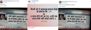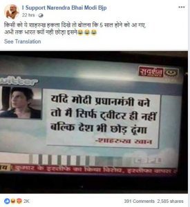 – यह संदेश फेसबुक पेज आई सपोर्ट नरेंद्र भाई मोदी बीजेपी (@bjpalindia) (I Support Narendra Bhai Modi Bjp (@bjpalindia) के एक पोस्ट का है। इसे सुदर्शन न्यूज के प्रसारण के कथित स्क्रीनशॉट पर चिपकाया गया था, जिसमें शाहरुख खान का यह कहता हुआ ‘ट्वीट’ दिखता है- “यदि मोदी प्रधानमंत्री बन जाते हैं, तो मैं न केवल ट्विटर, बल्कि भारत भी छोड़ दूंगा (अनुवादित)।“ इस आलेख को लिखने के समय तक इस पोस्ट के 3,000 से ज्यादा शेयर हुए थे।
