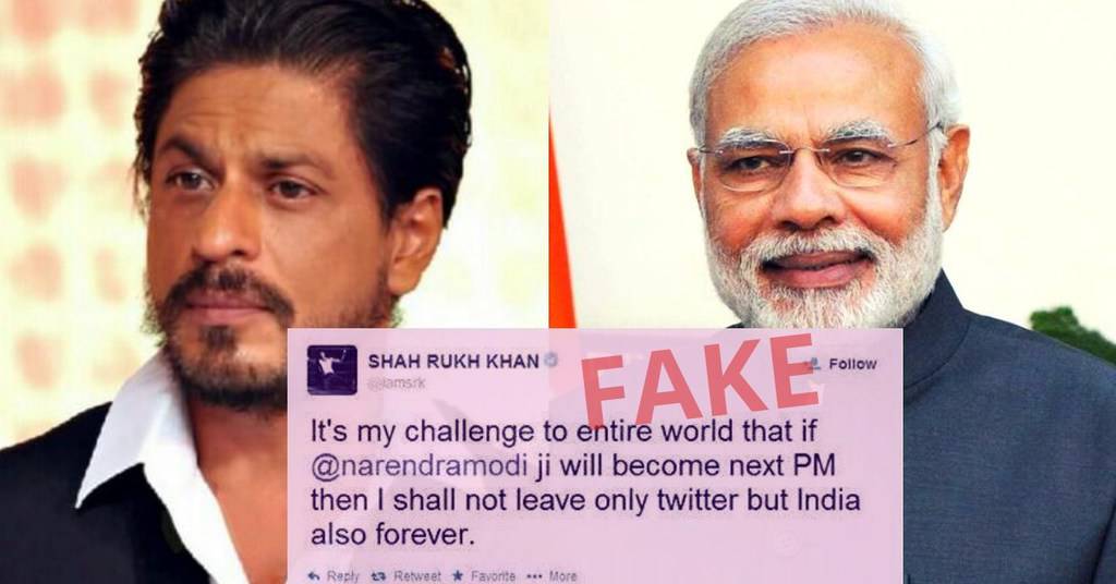 क्या शाहरुख खान ने कहा कि मोदी प्रधानमंत्री बने तो वह भारत छोड़ देंगे? फिर नकली ट्वीट वायरल
