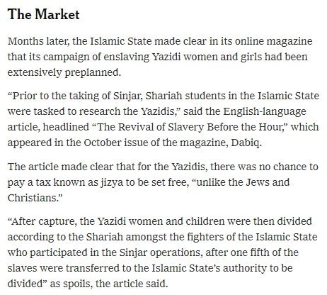 “हमारे पास यज़ीदी महिलाएं हैं, कुर्दी महिलाएं हैं, और हमारे पास ईसाई भी हैं। इन्हे पाना आपके लिए अब दाहिने हाथ का काम है, आइए और अपने गुलाम को ले जाईए। खुद के लिए एक सेक्स गुलाम रखिए। हमारे बहादुर सिपाही, बहादुर इस्लामिक स्टेट के लड़ाके इन इलाकों में गए और अपने मुर्तदीन (काफिर) बदमाश को मार डाला ताकि आज आप उनकी महिलाओ को पा सकते हैं। तकबीर, तकबीर, तकबीर (अल्लाह महान है)…”-(अनुवाद)।