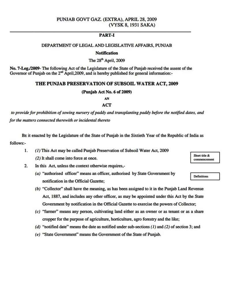 2009 में पंजाब सरकार ने यह फैसला तेजी से भू-जल के गिरते स्तर के मद्देनज़र लिया था. चूंकि धान की फसल को अत्यधिक पानी चाहिए होता है, सरकार ने पानी की निर्भरता मानसून से पूरी करने की अपील की. इस कानून के पहले तक किसान राबी की फसल के तुरंत बाद धान की बुवाई करते थे. भूमिगत जल से उसकी सिंचाई की जाती थी.