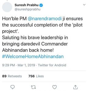 मंत्री ने ट्वीट किया था कि “माननीय पीएम मोदी जी पायलट प्रोजेक्ट के सफल समापन को सुनिश्चित करते हैं. उनके बहादुर नेतृत्व को सलाम, साहसी कमांडर अभिनंदन वापस घर लौट आए.”