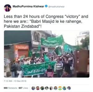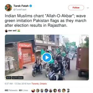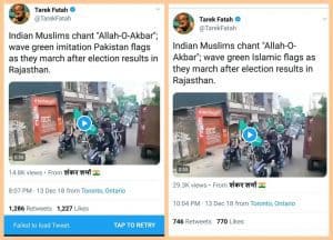 “राजस्थान के चुनावी नतीजों के बाद भारतीय मुस्लमान अल्लाह-ओ-अकबर के नारे लगाते हुए हरे पाकिस्तानी झंडे फहरा रहे है”-(अनुवादित), पाकिस्तानी लेखक तारेक फतह ने यह ट्वीट किया। साथ ही कथित रूप से राजस्थान में कांग्रेस की जीत के बाद मुसलमान समुदाय की रैली का वीडियो भी शेयर किया। ये ट्वीट 600 से ज़्यादा बार रीट्वीट किया गया।