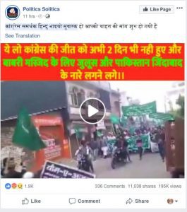 Politics Solitics नाम के फेसबुक पेज ने वही वीडियो इस सूचना के साथ शेयर किया, “कांग्रेस समर्धक हिन्दु भाइयो मुबारक हो आपकी चाहत की मांग शुरू हो गयी है।” अब तक ये पोस्ट ने तकरीबन 16,000 शेयर्स और 3 लाख से ज्यादा व्यूज हासिल कर लिए हैं।