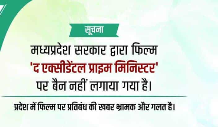मध्यप्रदेश सरकार के जनसंपर्क विभाग ने ट्वीट कर कहा कि द एक्सीडेंटल प्राइम मिनिस्टर पर बैन नहीं लगाया गया है. प्रदेश में फ़िल्म पर रोक लगाने की ख़बर गलत और भ्रामक हैं.