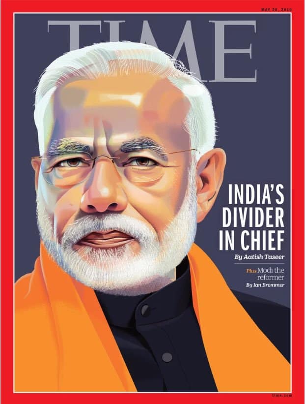 टाइम मैगजीन ने 20 मई के अंक के कवर पेज पर ‘इंडियाज़ डिवाइडर इन चीफ’ कैप्शन के साथ पीएम मोदी की तस्वीर छापी है. मैगजीन में मोदी के 5 सालों के कार्यकाल का विवरण और आलोचना की गई है.