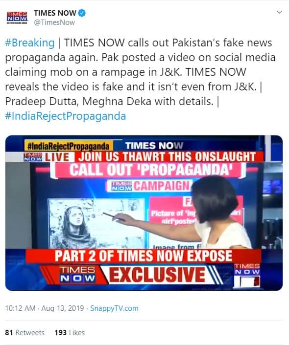 प्रसारण के दौरान स्क्रीन पर,“पाकिस्तान का झूठ पकड़ा गया” और “पाकिस्तान के ISI का प्रोपोगेंडा पकड़ा गया” चलाया जा रहा था। टाइम्स नाउ की एंकर कहा रही है कि,“कोई यह ट्विटर हैंडल चला चला रहा है जिसके नाम के साथ में पाकिस्तानी झंडा भी दिख रहा है और जब हमने इसकी पड़ताल की तो पाया कि यह तस्वीर काल्पनिक टीवी सीरीज ‘गेम ऑफ़ थ्रोन्स’ के एक दृश्य की है…और पाकिस्तान इस तरह के झूठे दावे के ज़रिये यह दिखाने की कोशिश कर रहा है कि भारत में अनुच्छेद 370 को अप्रभावी करने के बाद यह स्थिति है”-अनुवादित।