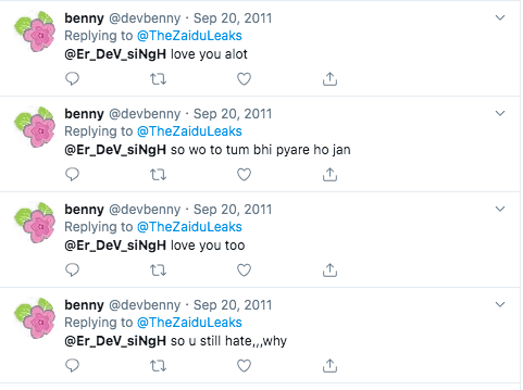 इस ट्विटर हैंडल को 2010 में बनाया गया था। जब ऑल्ट न्यूज़ ने हैंडल को संबोधित किए गए शुरुआती ट्वीट्स की खोज की, तो हमने पाया कि @thezaiduleaks अकाउंट को अपने शुरुआती दिनों में @er_dev_singh कहा जाता था।