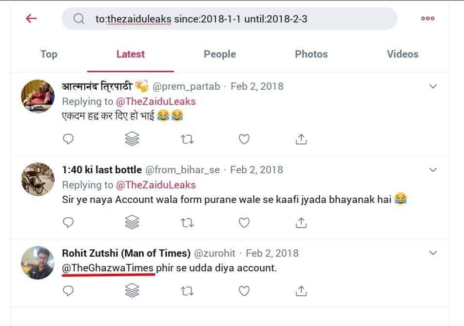 इस अकाउंट को बाद में @theghazwatimes नाम दिया गया था। हमें इस बात का पता जनवरी और फरवरी 2018 के बीच @thezaiduleaks हैंडल को किए गए रिप्लाई से लगा।