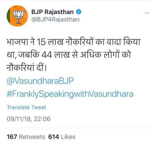 मुख्यमंत्री भी साबित नहीं कर सकती हैं कि उनकी सरकार ने 44 लाख नौकरियाँ दी हैं। राजस्थान बीजेपी ने वसुंधरा राजे के ट्विटर अकाउंट को भी टैग किया है। प्रधानमंत्री भी साबित नहीं कर सकते हैं कि दिल्ली में उनकी सरकार ने 44 लाख नौकरियाँ दी हैं। आज के समय में कोई भी राज्य सरकार चाहे वह किसी पार्टी की हो, दावा नहीं कर सकती है और न साबित कर सकती है कि उसमें पाँच साल में 44 लाख नौकरियाँ दी हैं।
