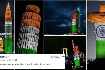 निष्कर्ष: यह बताते हुए — कि प्रधानमंत्री नरेंद्र मोदी के कार्यकाल के दौरान भारत के अंतरराष्ट्रीय संबंधों में हुई तरक्की का ये सबूत हैं — विभिन्न अंतरराष्ट्रीय स्मारकों पर भारतीय राष्ट्रीय ध्वज के प्रकाशित होने की डिजिटल रचना से बनाई गईं तस्वीरों का इस्तेमाल, सोशल मीडिया यूजर्स को भ्रमित करने के लिए किया जा रहा है।