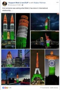 अंतरराष्ट्रीय स्मारकों पर दिख रहे भारतीय झंडे की तस्वीरों का एक सेट सोशल मीडिया पर वायरल है। फेसबुक पेज ‘आई सपोर्ट मोदी जी एंड बीजेपी‘ ने इन तस्वीरों को यह कहते हुए पोस्ट किया है, “और कुछ लोग पूछ रहे थे कि मोदी जी ने अंतरराष्ट्रीय संबंधों को लेकर क्या किया है।” सिर्फ इस पेज से इसे अब तक 4,600 से अधिक बार शेयर किया गया है। एक व्यक्ति ‘Bharath EY‘ के पोस्ट को करीब 1,800 शेयर मिले हैं।