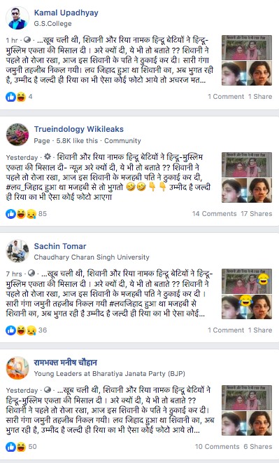 “#आपको याद होगा रमजान महीने में ये खबर खूब चली थी, शिवानी और रिया नामक हिन्दू बेटियों ने हिन्दू-मुस्लिम एकता की मिसाल दी । अरे क्यों दी, ये भी तो बताते ?? शिवानी ने पहले तो रोजा रखा, आज इस शिवानी के पति ने ठुकाई कर दी। सारी गंगा जमुनी तहजीब निकल गयी। लव जिहाद हुआ था शिवानी का, अब भुगत रही है, उम्मीद है जल्दी ही रिया का भी ऐसा कोई फोटो आये तो अचरज मत करना। मूर्खता का परिणाम तो मिलना ही चाहिए”।