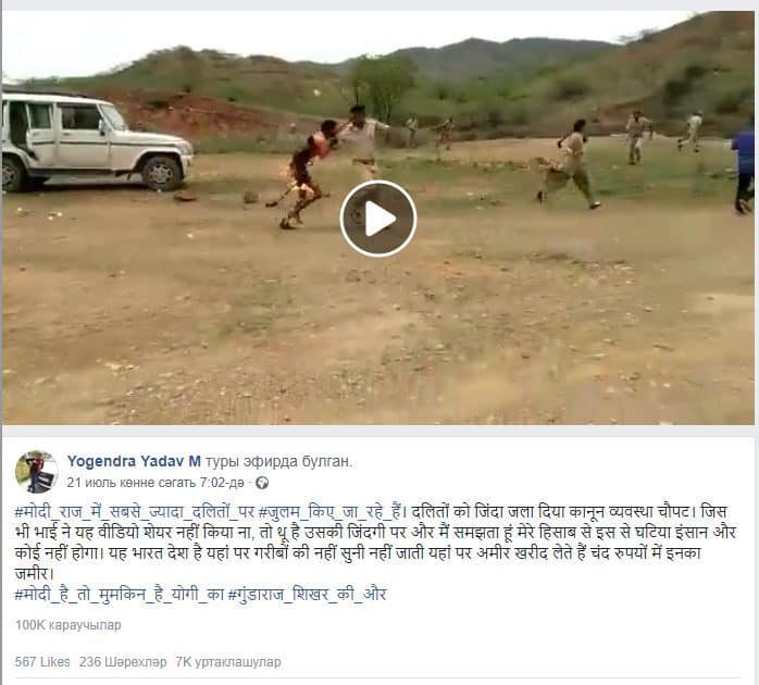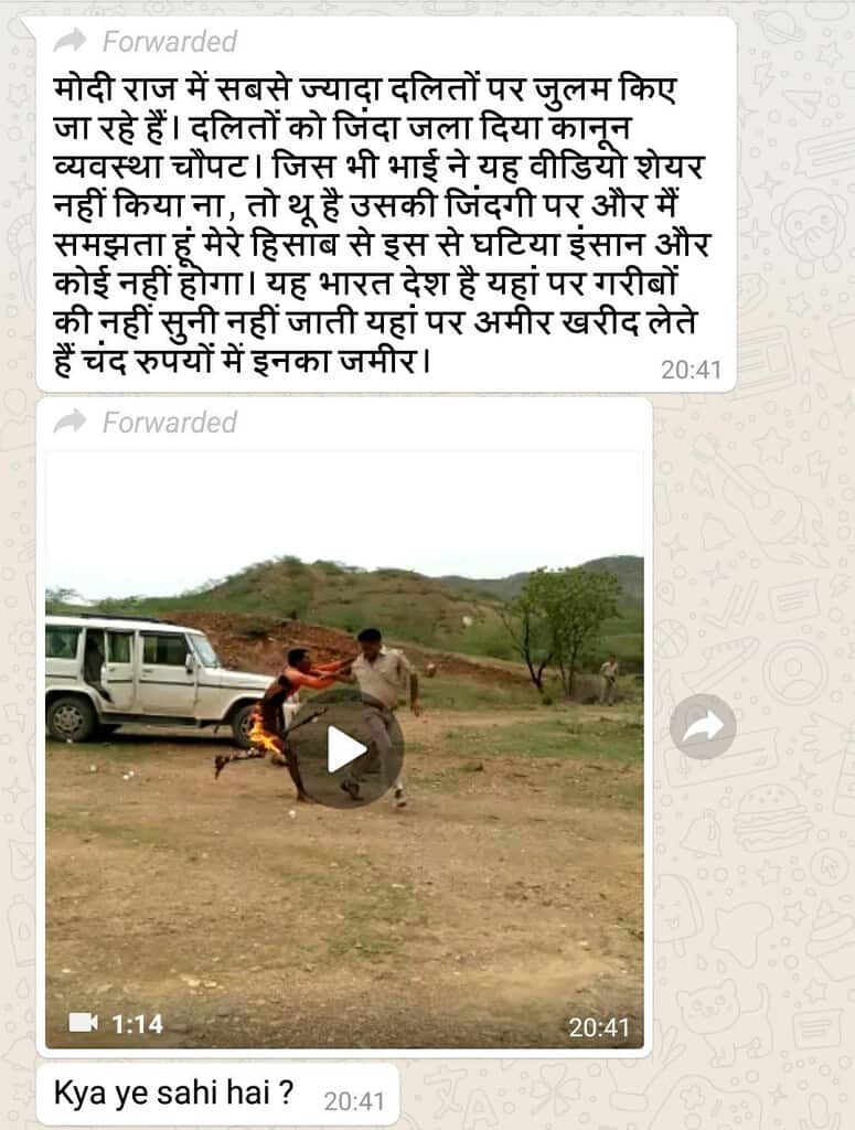 “मोदी राज में सबसे ज्यादा दलितों पर जुलम किए जा रहे हैं। दलितों को जिंदा जला दिया कानून व्यवस्था चौपट”, इस संदेश को सोशल मीडिया में एक व्यक्ति के जलने के वीडियो के साथ साझा किया गया है। संदेश में इस घटना की जगह और समय के बारे में कुछ भी नहीं दिया हुआ हुआ है। समान दावे से यह वीडियो फेसबुक पेज Yogendra Yadav M ने भी साझा किया है। हालांकि उन्होंने बाद में पोस्ट को डिलीट कर दिया था, लेकिन आप उसके आर्काइव को यहां पर देख सकते है।