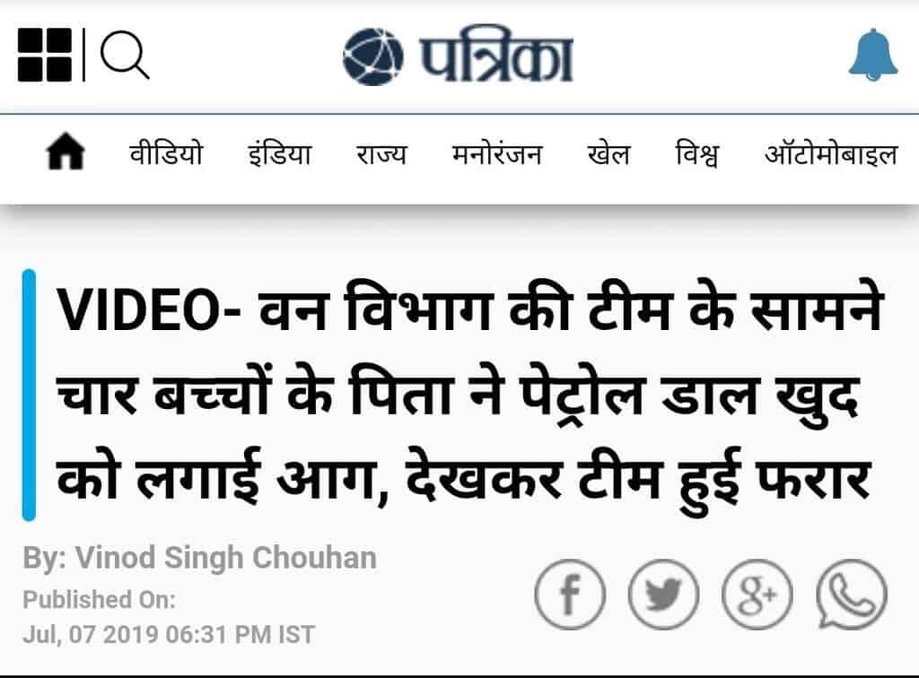 गूगल पर कीवर्ड्स से सर्च करने पर ऑल्ट न्यूज़ ने पाया कि यह घटना जुलाई 2019 में राजस्थान के झुंझुनू जिले में हुई थी। पत्रिका के अनुसार, 50 वर्षीय बाबूलाल सैनी ने आत्मदाह का प्रयास किया था, जब वन अधिकारियों ने कथित तौर पर अतिक्रमित ज़मीन से उसके परिवार को हटाने के काम कर रहे थे जो ज़मीन कथित तौर पर वन विभाग के अधिकार में थी।