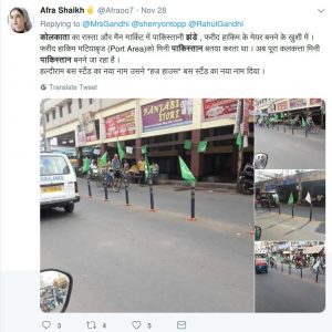 कथित रूप से पाकिस्तानी राष्ट्रीय झंडों से सजी सड़कों की तस्वीरों का संग्रह व्हाट्सएप पर प्रसारित किया गया है। दावा किया गया कि ये झंडे पश्चिम बंगाल के कोलकाता में फिरहाद हकीम के हाल ही में मेयर चुने जाने के जश्न में लगाए गए थे।