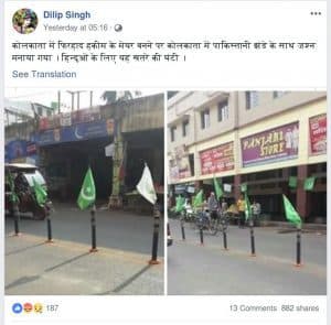 फेसबुक यूजर दिलीप सिंह ने तस्वीरों इन को एक खतरनाक संदेश के साथ पोस्ट किया, “कोलकाता में फ़िरहाद हकीम के मेयर बनने पर कोलकाता में पाकिस्तानी झंडे के साथ जश्न मनाया गया। हिंदुओं के लिए यह खतरे की घंटी।” इस लेख के लिखे जाने तक, उनके पोस्ट को करीब 900 से ज्यादा शेयर मिले थे।