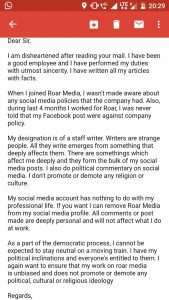 उसने अगले कुछ ही घंटों में जवाब भेज दिया, जिसमें लिखा कि सोशल मीडिया उसका व्यक्तिगत स्पेस है और जो वह वहां लिखता है उससे उसके पेशेवर जीवन का कोई लेना-देना नहीं है। इसके अलावा उसने कंपनी की कोई लिखित सोशल मीडिया नीतियां, कॉन्ट्रैक्ट और कोड ऑफ़ कंडक्ट में भी ऐसा कहीं नहीं लिखा होने की बात कही। इसके अलावा उसने यह भी लिखा कि अगर कंपनी को कोई परेशानी है, तो वह अपने सोशल मीडिया अकाउंट से कंपनी का नाम हटा सकता है।