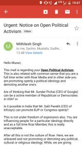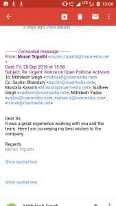 इस बीच 17 सितम्बर के दिन उसके पास ऑफिस से मेल आया। उस दिन वह छुट्टी पर था। यह उसकी अब तक की पहली छुट्टी थी। मेल में  भेजे गए अर्जेंट नोटिस में उसके ऊपर ओपेन पोलिटिकल एक्टिविज्मकरने का आरोप लगाया गया और कहा गया कि सात दिनों के भीतर उसे यह साफ़ करते हुए जवाब भेजना होगा कि आखिर उसे नौकरी से क्यों न निकाला जाए!