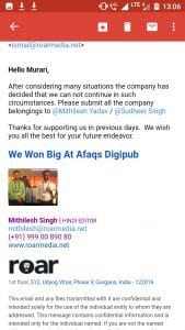 इसके बाद कंपनी ने 24 सितंबर को उसपर कार्यवाही करने की बात कही और फिर 24 सितंबर को संपादक ने उसे अपने केबिन में बुलाकर कहा कि अगर वह माफ़ी मांग ले और सोशल मीडिया पर मौजूद अपनी सभी पुरानी पोस्ट डिलीट कर दे तो कंपनी उसे नौकरी से नहीं निकालेगी। मुरारी ने ऐसा करने से मना कर दिया, तो संपादक महोदय ने कोई नई नौकरी खोज लेने की बात कही। आगे 28 सितंबर के दिन संपादक ने उसे दोबारा मेल भेजा, जिसमे लिखा था कि कंपनी उसकी सेवाएं रद्द कर रही है और अब काम पर आने की जरूरत नहीं है। मुरारी ने भी मेल करके कंपनी को उसके सुनहरे भविष्य के लिए शुभकामनाएं भेज दीं और अपना बैग लेकर घर चला आया। अभी तक इस महीने की तनख्वाह उसे नहीं मिली है। संपादक ने जल्द ही तनख्वाह भेजने का वादा किया है।